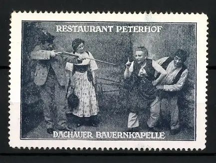 Reklamemarke Restaurant Peterhof, Mitglieder der Dachauer Bauernkapelle in einer Szene, Humoristen