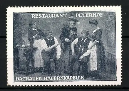 Reklamemarke Restaurant Peterhof, Mitglieder der Dachauer Bauernkapelle in einer Szene, Humoristen