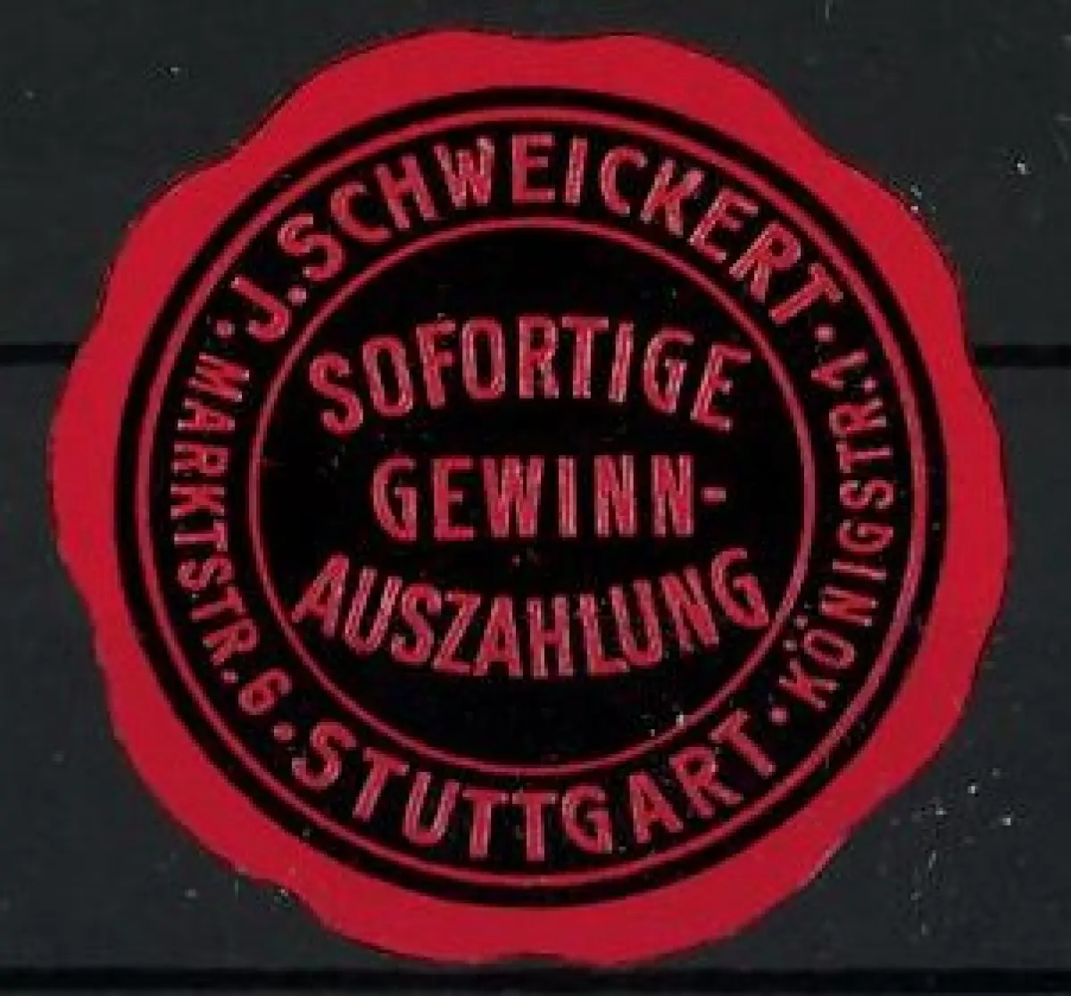 Reklamemarke Stuttgart, J. Schweickert, Sofortige Gewinnauszahlung, Siegelrand