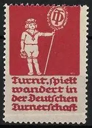 Reklamemarke Turnt, spielt wandert in der Deutschen Turnerschaft, Junge mit Fahne