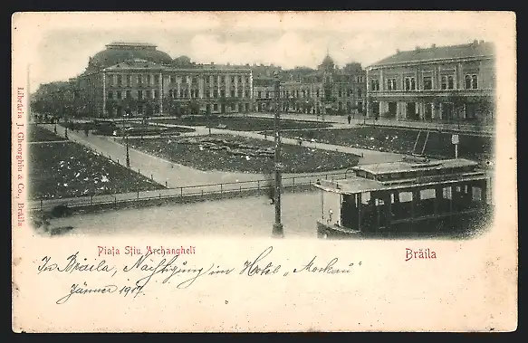 Relief-AK Braila, Piata Stiu Archangheli, Strassenbahn