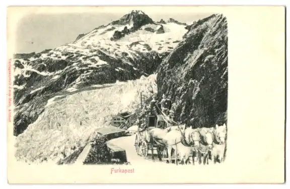 Relief-AK Furka, Postkutsche der Furkapost, Blick auf den Gletscher