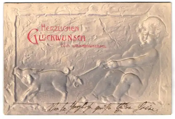 Relief-AK Kind zieht Schwein zu Neujahr an der Hufe und fängt damit das Glück