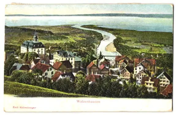 Relief-AK Walzenhausen, Ortsansicht mit der Flussmündung