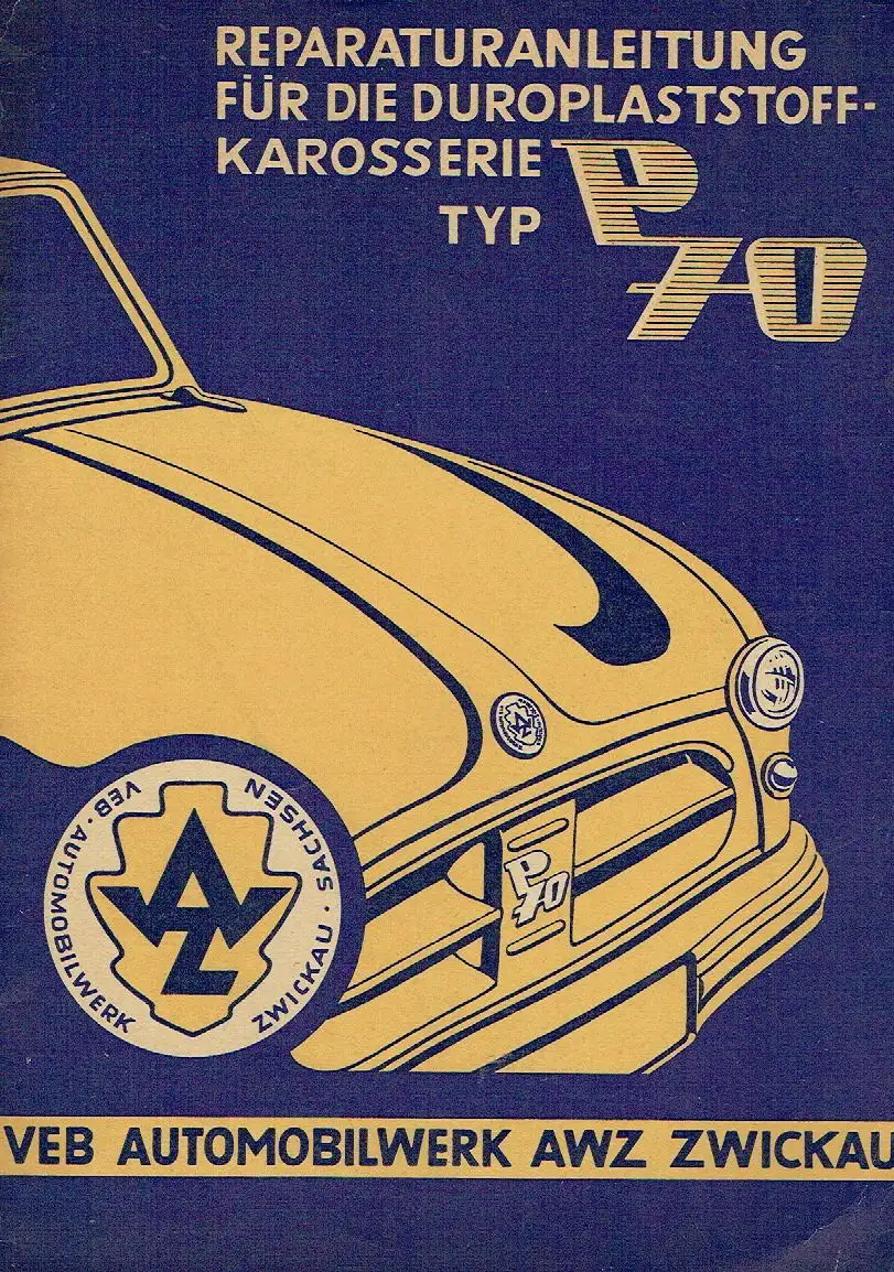 guter Zustand, geringe Gebrauchs- und Alterungsspuren: Umschlag teils mit kleinen Randblessuren - Rücken leicht beschabt - Umschlag und Seiten teils etwas eselsohrig - untere Deckelecke mehrfach geknickt - Papier vergilbt, aber Seiten sauber und ordentlich, entgegen des Textes auf der Titelseite steht auf dem Deckel "Reparaturanleitung für die Duroplast-Karosserie Typ P70", dem Vorläufer des Trabant "Der P 70 war ein Kleinwagen, der vom IFA-Betrieb VEB Automobilwerk Zwickau (als AWZ P 70 „Zwickau“), später VEB Sachsenring Automobilwerke Zwickau (als Sachsenring P 70) hergestellt wurde. Der Motor wurde im Barkas-Werk produziert. Die Bezeichnung P 70 steht für Personenkraftwagen mit 700 cm³ Hubraum. Der P 70 war nach der Chevrolet Corvette eines der ersten Serienfahrzeuge mit Kunststoffkarosserie und das erste überhaupt, dessen Kunststoff-Karosserie nicht in Handarbeit hergestellt wurde. Der P 70 war auf Basis des IFA F 8 als Zwischentyp zur Erprobung des neuartigen Karosseriematerials vorgesehen, konnte wegen des zu hohen Preises jedoch nicht der Massenmotorisierung in der DDR dienen. Diese Funktion übernahm der preisgünstiger hergestellte Trabant, der 1958 serienreif wurde und den P 70 ablösen konnte. Das erklärt die für DDR-Verhältnisse sehr kurze Bauzeit des P 70 von nur vier Jahren. In den Jahren 1955 bis 1959 wurden 36.151 Fahrzeuge in den Bauformen Limousine, Coupé (ca. 1500 Stück) und Kombi produziert." (Wikipedia), kartoniert, ca. 21 x 29,5, 15 Seiten mit 21 Bildern