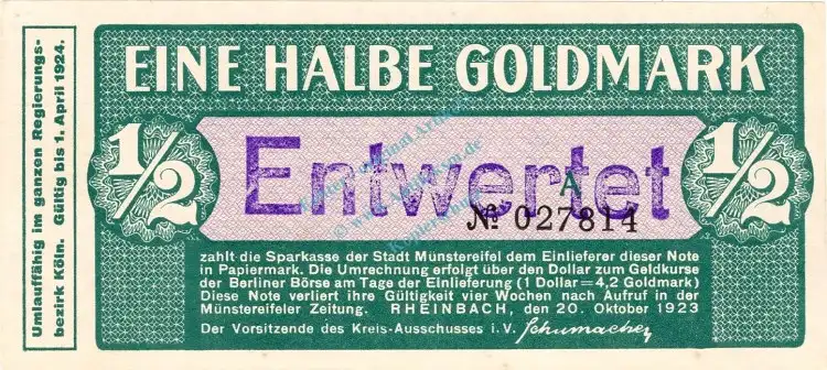 Rheinbach , Banknote 1 halbe Gold Mark Schein unc-kfr.E Müller 4195.1 , Rheinland 1923 Wertbeständig