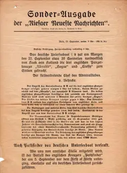 Riesaer Neuste Nachrichten Sonder Ausgabe Unterseeboot U9 versenkt englische Panzerkreuzer 23.9.1914