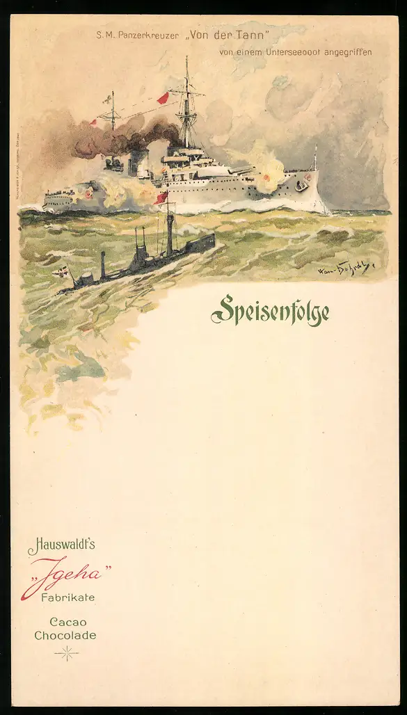 Riesen-AK Hans Bohrdt: Kriegsschiff S.M. Panzerkreuzer Von der Tann wird von einem U-Boot angegriffen, Igeha Kakao