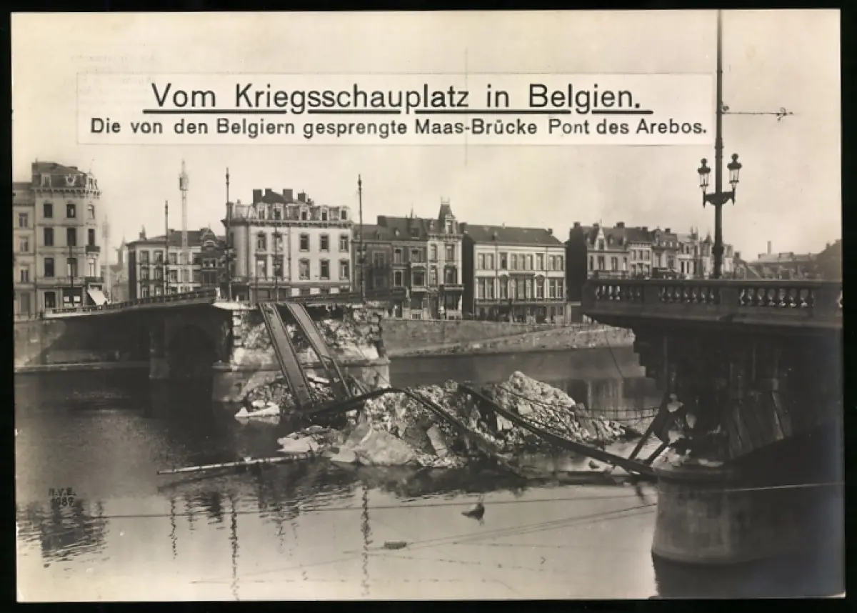 Riesen-AK Lüttich, von den Belgiern gesprengte Maas-Brücke Pont des Arebos, Kriegszerstörung