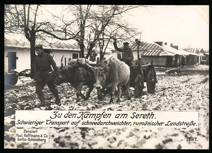 Riesen-AK Soldaten mit Ochsenkarren beim schwierigen Transport auf schneedurchweichter Landstrasse in Rumänien