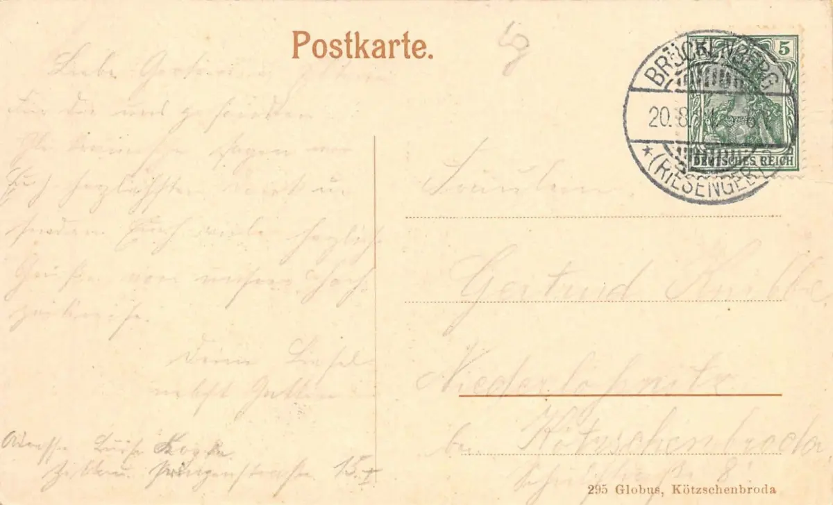Rückseite: gelaufen 1911 von Brückenberg (Riesengeb.)