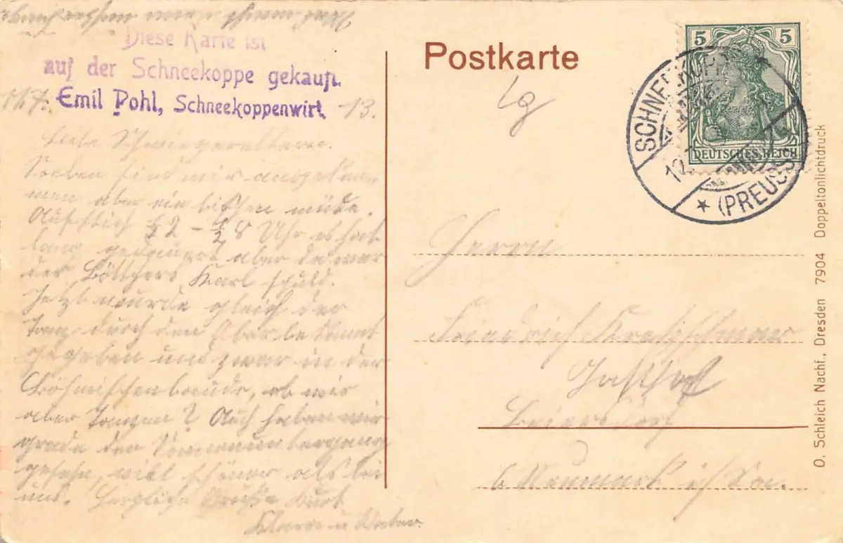 Rückseite: gelaufen 1913 von Schneekoppe (Preuss.)