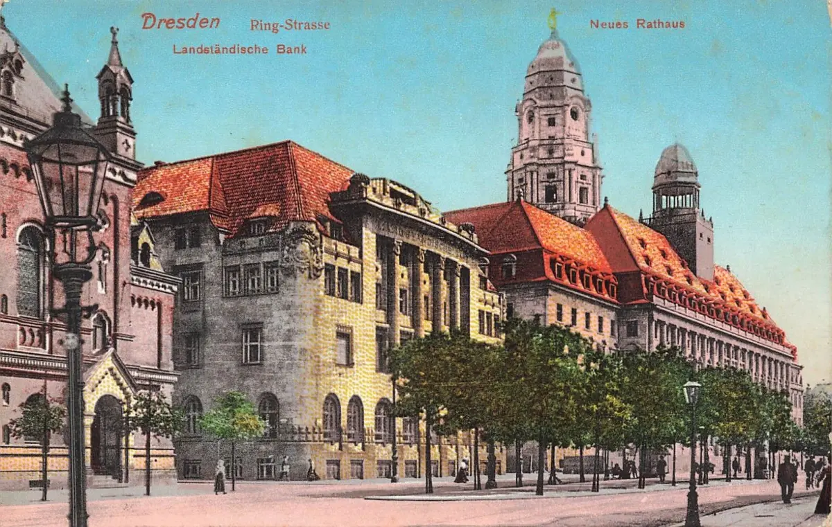 Ring Strasse, Neues Rathaus und Landständische Bank Dresden Sachsen Postkarte AK