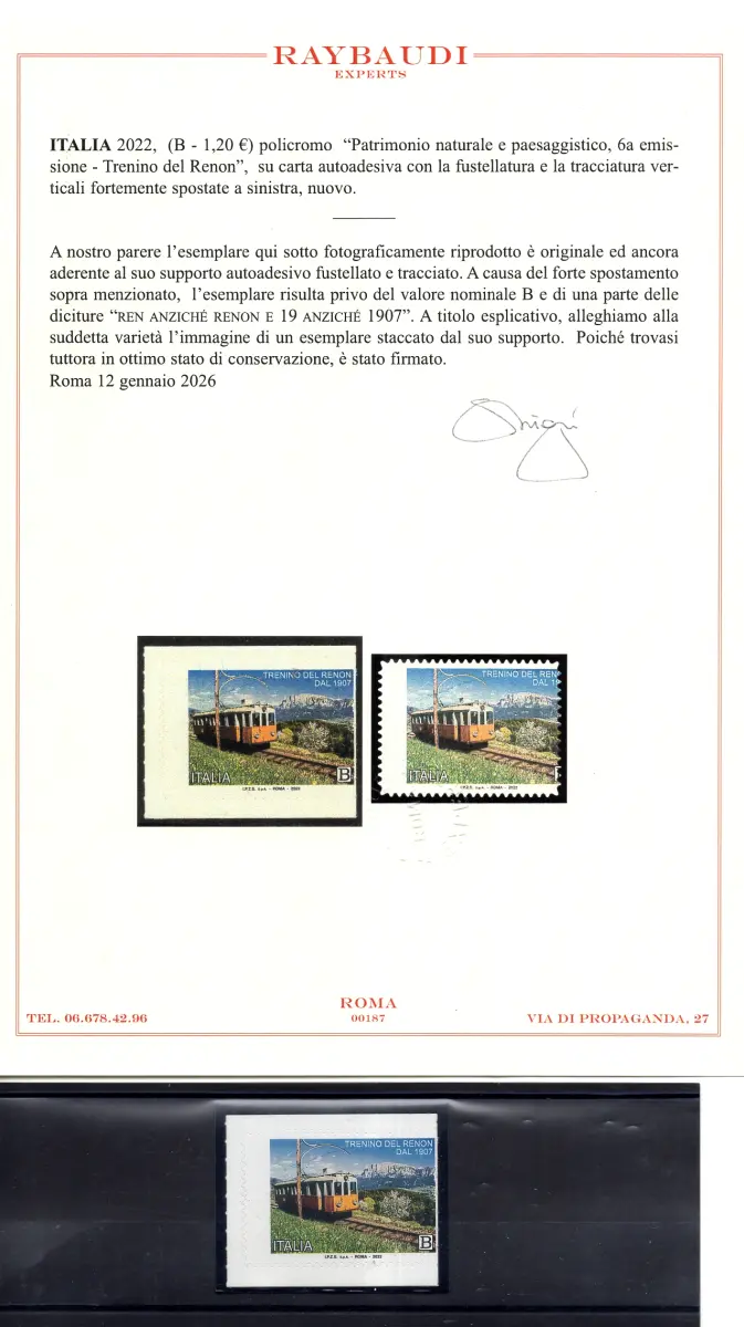 postfrisch - Vollgummi - - Rittner Zug Nr. 4208 mit stark nach links verschobener Stanzung und Spurführung - durch starke Verschiebung fehlt dem Exemplar der Nennwert B - (Kat. Einheitsnr. 4271Ba) - Selten - Zert. Ray. - Kat. euro 450 Cod.818/182