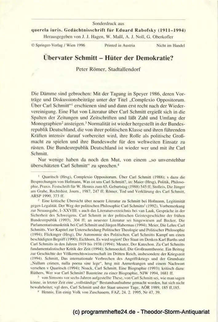 Sonderdruck aus querela iuris. Gedächtnisschrift für Eduard Rabofsky ( 1911-1994 ). Herausgegeben von J.J. Hagen, W. Maßl, A. J. Noll, G. Oberkofler - Schlüsselwörter: Theaterprogramm, Opernprogramm, Ballettprogramm, Musicalprogramm, Konzertprogramm, Theatermemorabilia, Programmhefte Sammlung, deutsche Theatergeschichte.