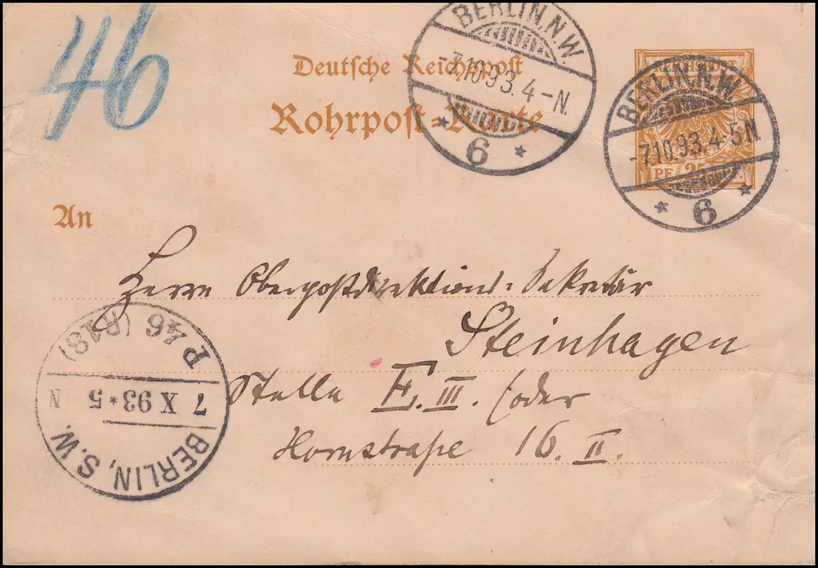 Rohrpost-Karte RP 8 Adler 25 BERLIN N.W. 6 - 7.10.93 n. BERLIN P 46 (R 18) 7.10.