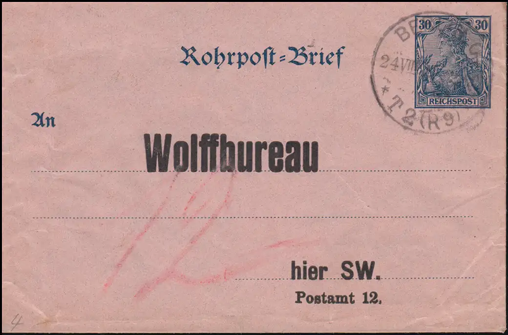 Vordruck-Rohrpostbrief an das Wolffbureau in Berlin SW / Postamt 12