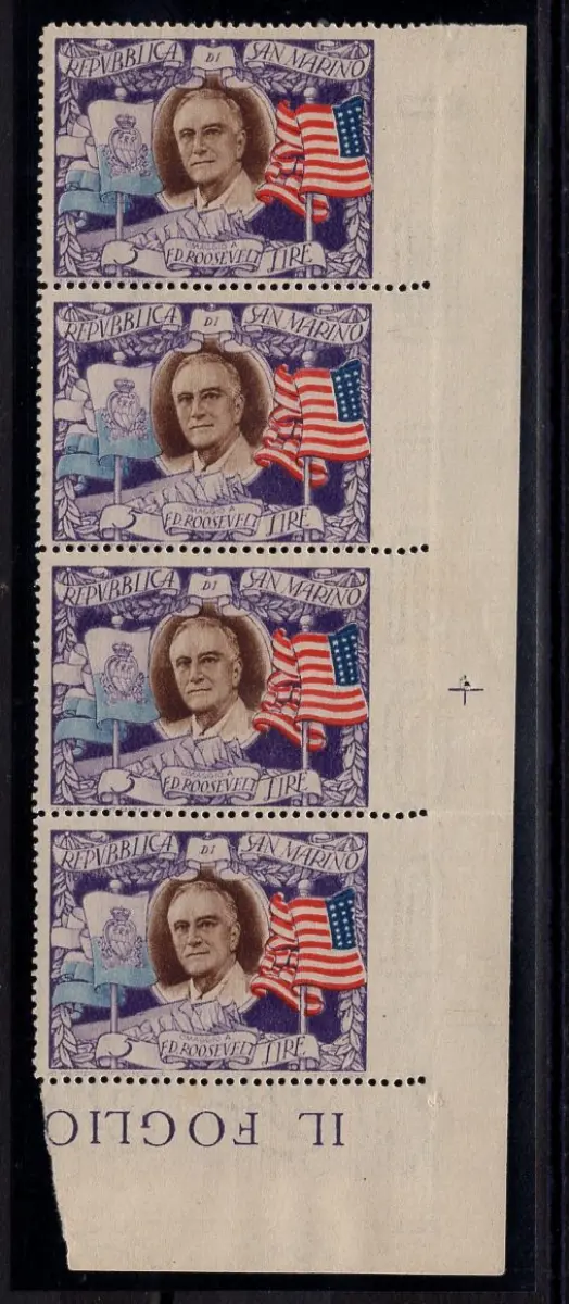 MNH - Vollgummi - Roosevelt 5 Lire Nr. 303e ungezahnter Vierwinkel-Blattstreifen rechts, neuer perfekter Vollgummi - Kat. euro 440 Cod. 3376/WEB