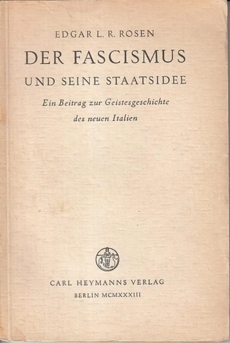 Rosen, Edgar L. R: Der Fascismus und seine Staatsidee. Ein Beitrag zur Geistesgeschichte des neuen Italien. Vom Risorgimento zum F. / Vorläufer und Wegbereiter der fascistischen Ideologie / Entwicklung des f. Staatsgedankens 1919 - 1925 / heutige Gestalt.