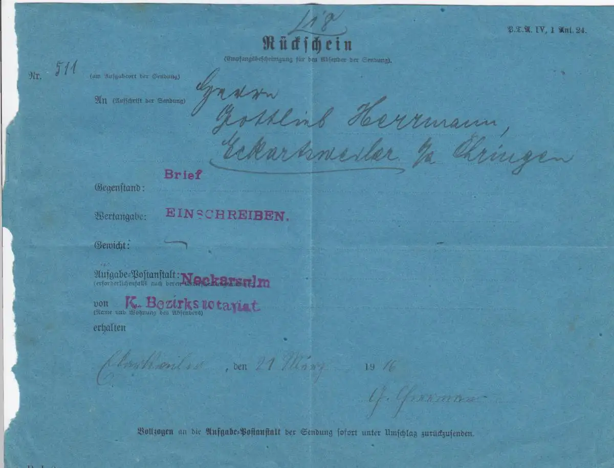 Rückschein Neckarstulm nach Öhringen 1916
