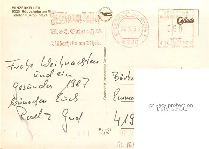 Ruedesheim_Rhein Restaurant Winzerkeller Ruedesheim Rhein postalisch gelaufen 1986 Erhaltung siehe scans [FriedD77] Frierer