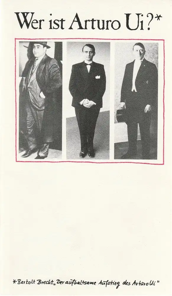 Originalbroschur, 52 Seiten, viele Fotos, darunter mehrere Probenfotos, beiliegende Besetzungsliste, einmal gefaltetes Blatt, enthält Zeittafel zu Arturo Ui, Zustand: gut, Läsuren an den Aussenkanten der Besetzungsliste