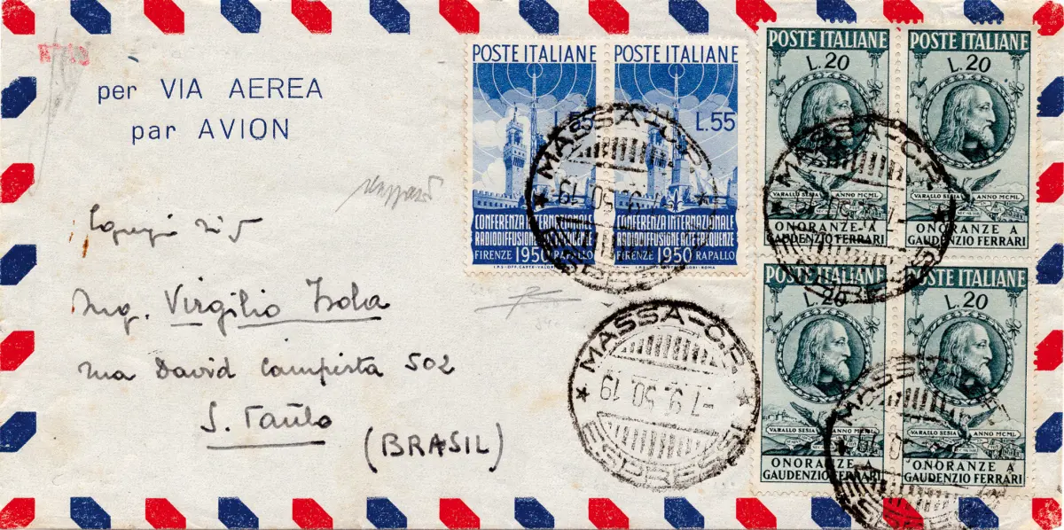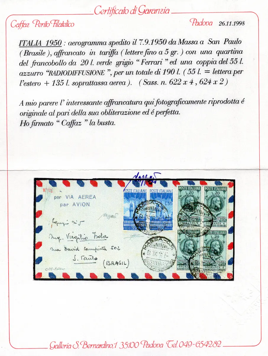 BEUTEL - Rundfunk Lire 55 Nr. 624 Paar + Ergänzung Nr. 622 Viertel auf Luftumschlag für Brasilien am 7.9.50 - Selten, im Tarif - Zert. RD + Cert. Caffaz - Kat. euro 2.000++ Cod.412/182