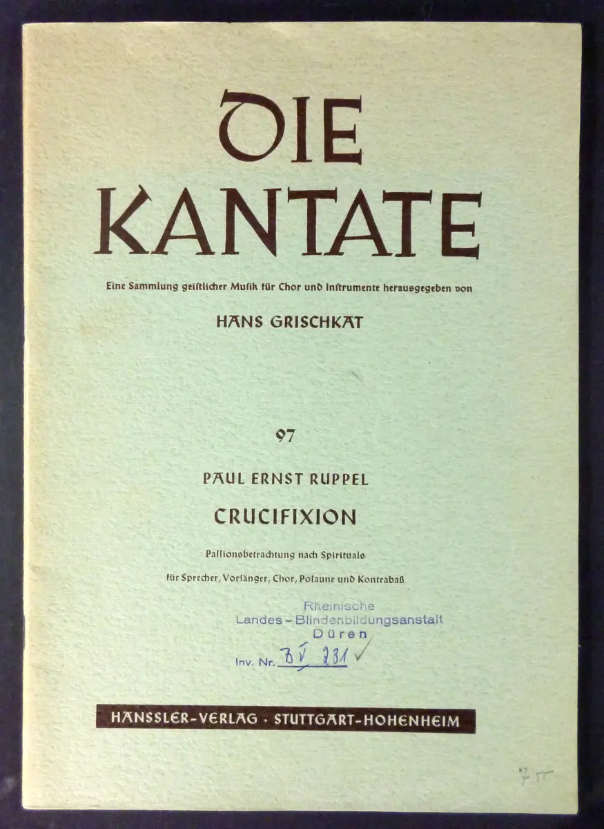 Ruppel, Paul Ernst: Crucifixion. Passionsbetrachtung nach Spirituals für Sprecher, Vorsänger, Chor, Posaune und Kontrabaß. (Die Kantate. Eine Sammlung geistlicher Musik für Chor und Instrumente herausgegeben von Hans Grischkat, 97.).