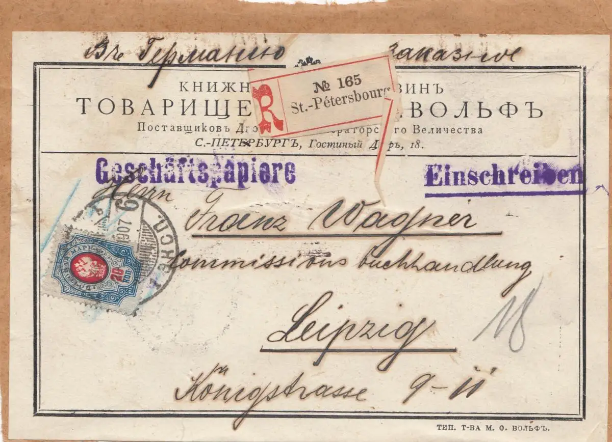 Russland: 1907: Geschäftspapiere als Einschreiben nach Leipzig, Ausschnitt