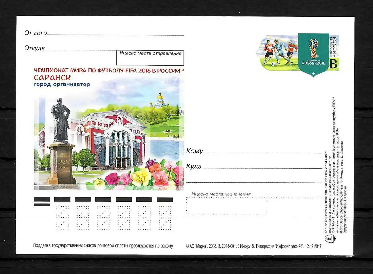 Russland: 2018 Fußball WM: Austragungsort: Saransk, Ganzsache **