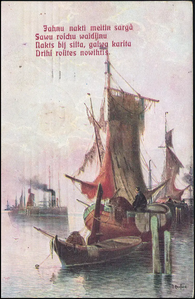 Russland 47 Freimarke 3 Kop. rot auf AK Im Hafen mit Gedicht, RIGA 27.2.1909
