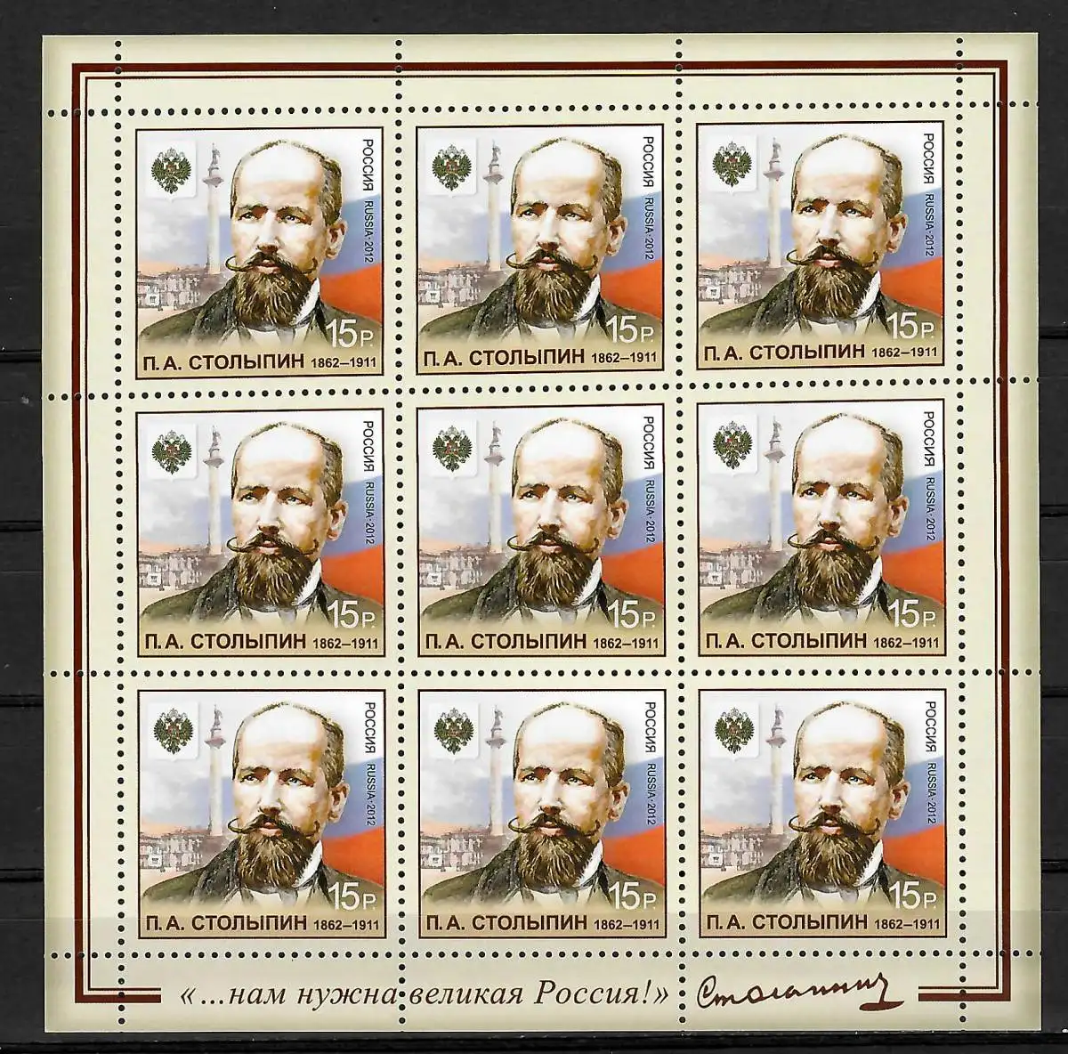 Russland: Kleinbogen 150. Geburtstag von Pjotr Stolypin, #1800, postfrisch