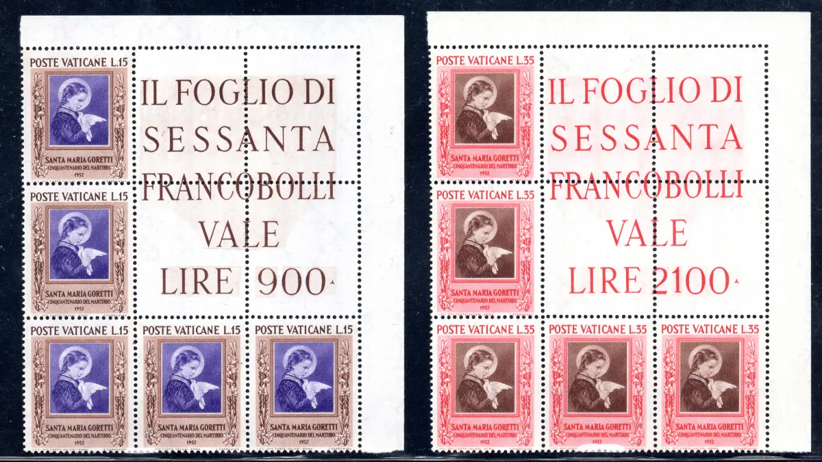 Vollgummi MNH - Santa Maria Goretti die Serie von zwei Werten im Eckblock von fünf Exemplaren (Katalog Coll.it. n. 1/2) - neu perfekt mit Vollgummi - Ungewöhnlich diese Bedingungen Katalog Euro200 Cod.2172/WEB