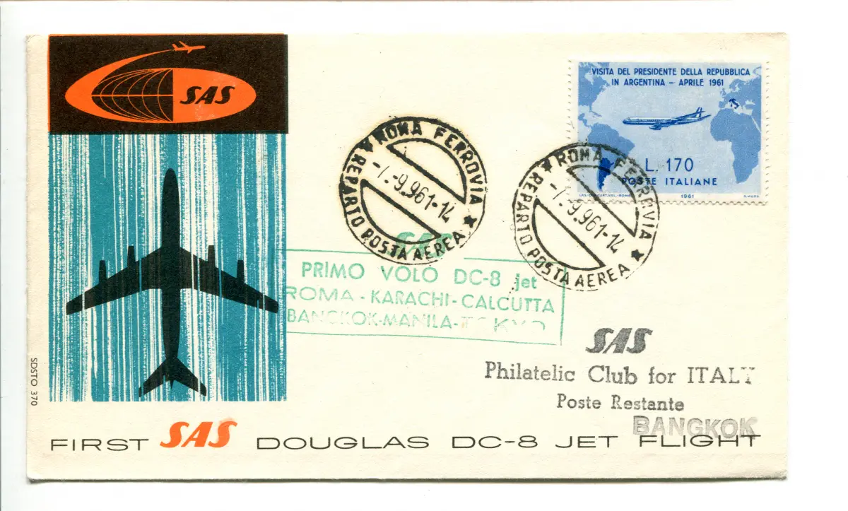 SAS Fernost-Flüge vom 7.9.61 - Lot von neun BUSTA-Flugzeugen - SAS Fernost-Flüge vom 7.9.61 - Lot von neun verschiedenen Aerogrammen der Flüge von Rom nach Karaky, Kalkutta, Bangkok, Manila und Tokio und den jeweiligen Rückflügen (Flug von Bankok fehlt) - Die fünf Aerogramme aus Italien sind mit Werten der Gronchi-Serie frankiert (Kat. Pellegrini Nr. 1458/1464 + 1466/1467) - Schönes Set Cod. 317/16