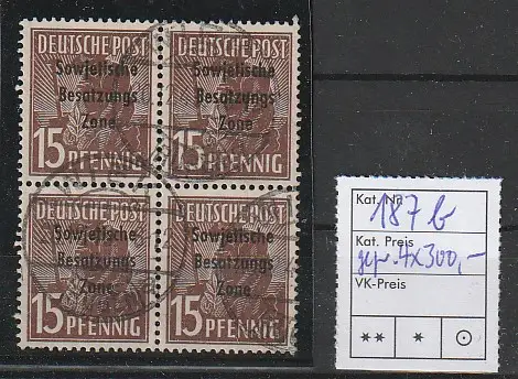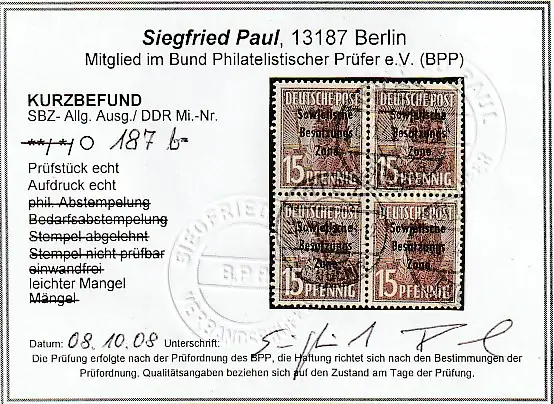 SBZ: 15 Pfg. AS mit Aufdruck, 4er-Block gest. in b-Farbe, Befund Paul