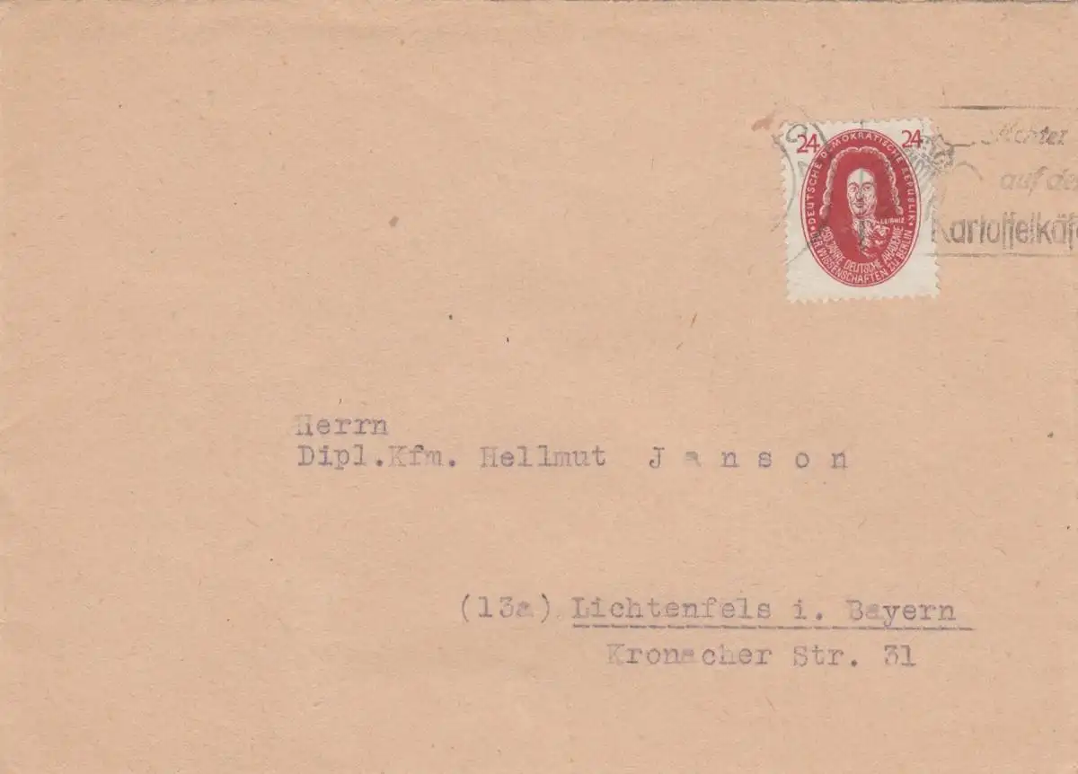 SBZ: 1949: Brief Leipzig, Achtet auf den Kartoffelkäfer nach Lichtenfels i. Bay.