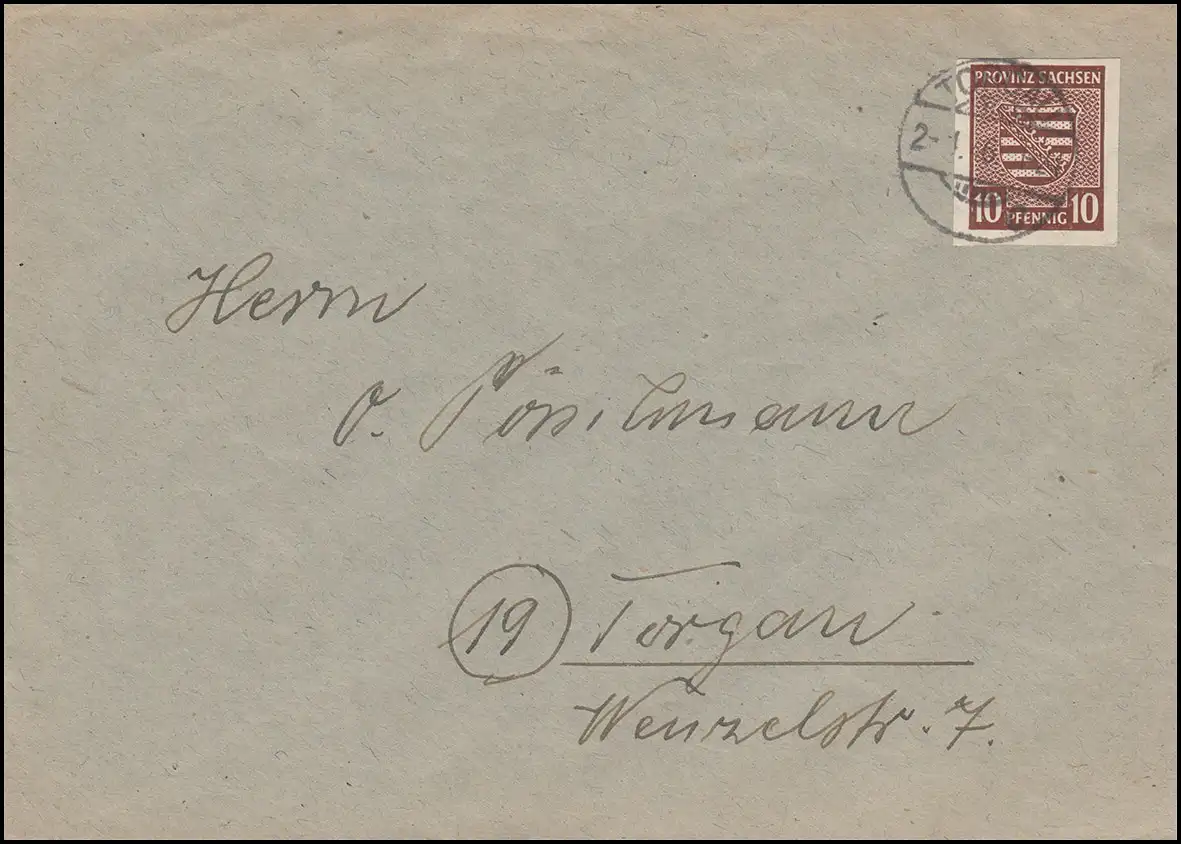 SBZ 72 Provinzwappen 10 Pf. ungezähnt, Brief Torgau 2.1.46 geprüft Ströh BPP