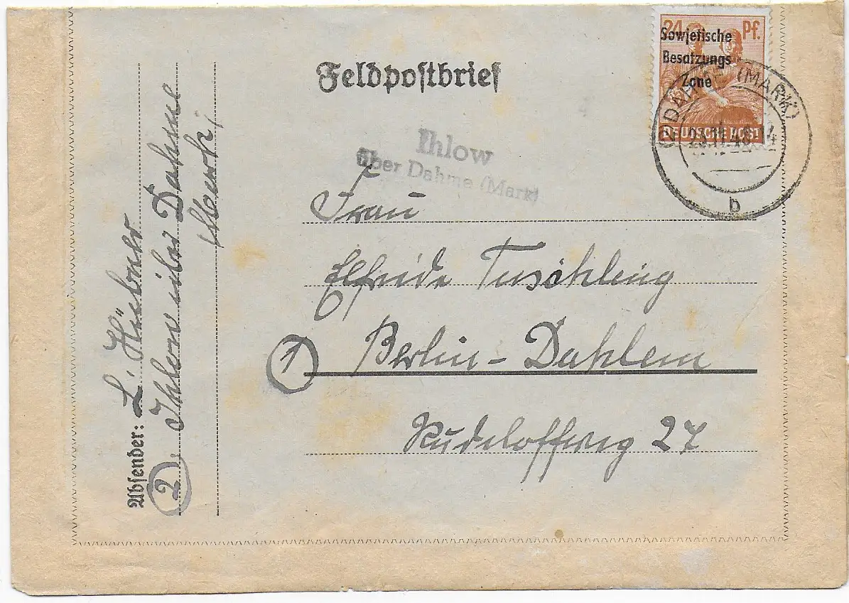 SBZ Landpost Ihlow über Dahme/Mark nach Berlin, 1948, Textinhalt