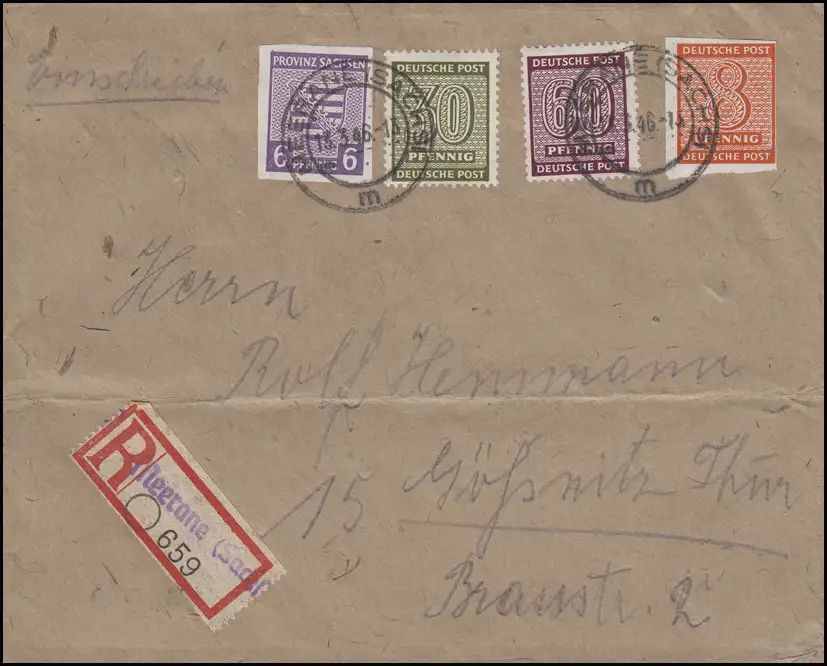 SBZ-MiF Ziffern und Wappen R-Bf Not-R-Zettel MEERANE 13.3.46 nach GÖSSNITZ 14.3.