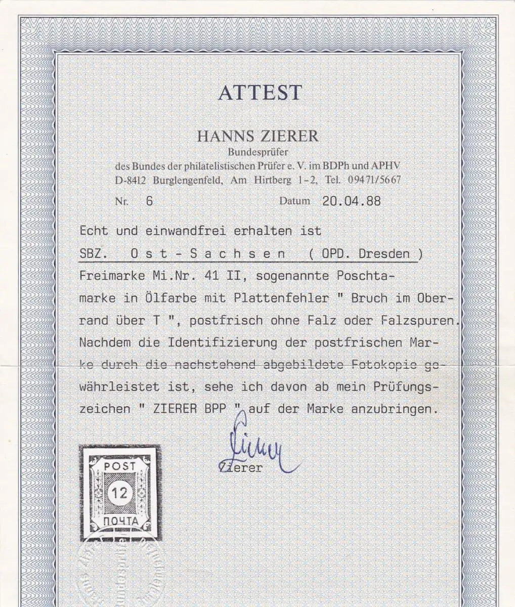 SBZ: MiNr. 41 II, Ostsachsen, postfrisch, BPP Attest