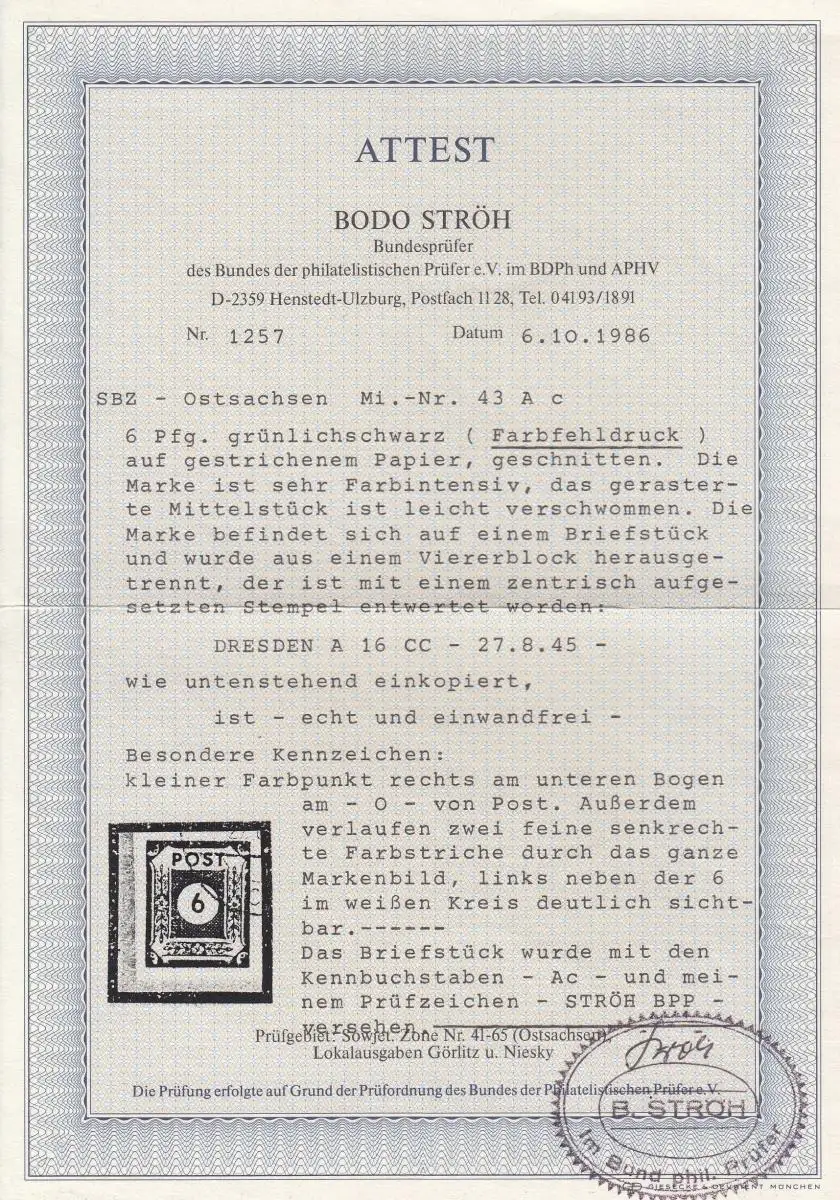SBZ: MiNr. 43 A c, gestempelt Dresden, Farbfehldruck, Briefstück, BPP Attest