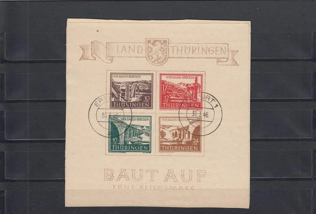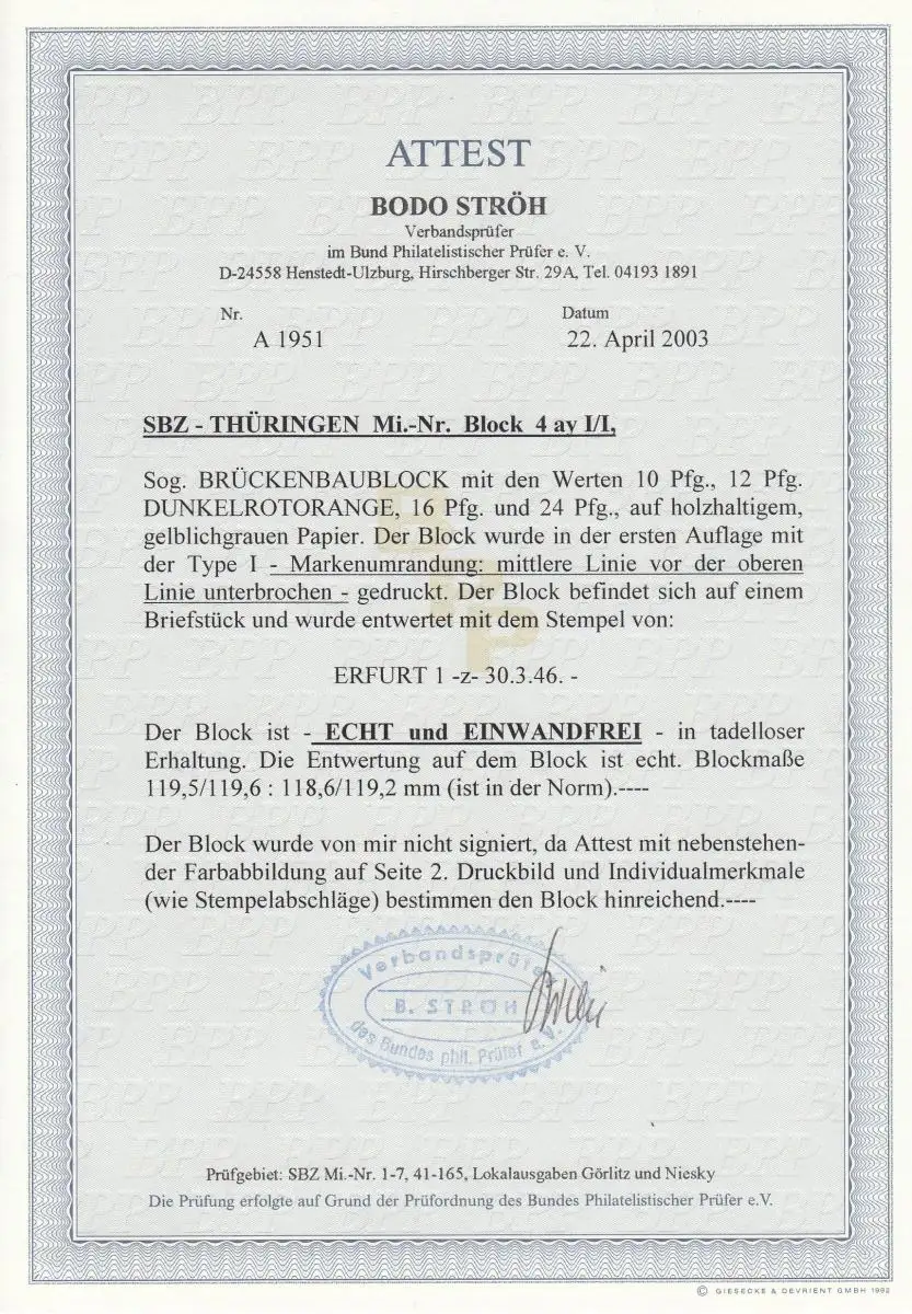 SBZ-Thüringen: MiNr. Block 4 ay I/I (IV), gestempelt Erfurt, BPP Attest