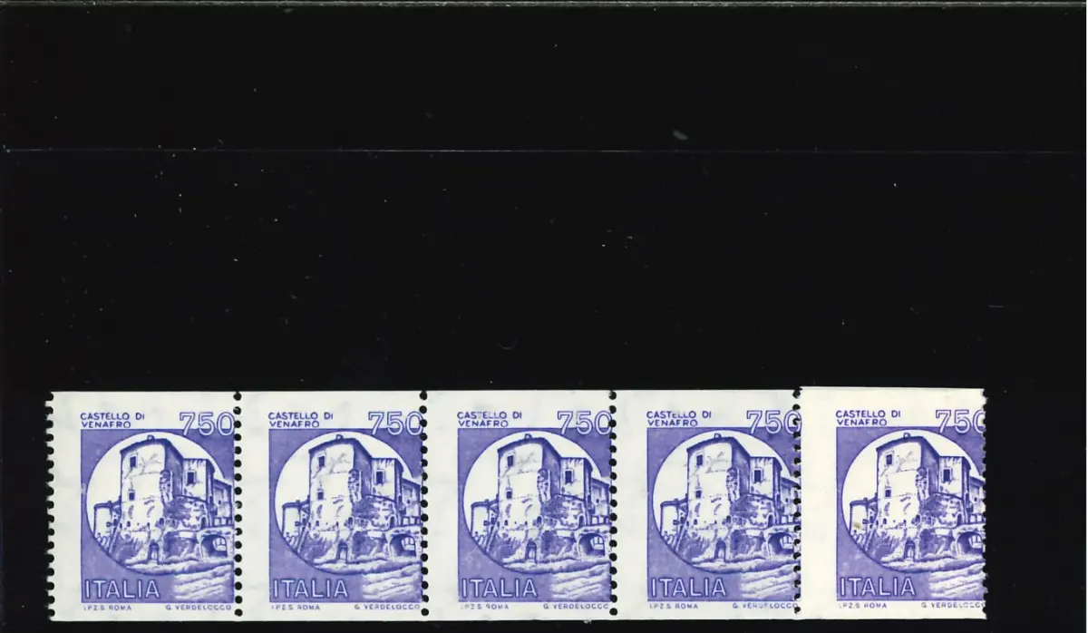 MNH - Vollgummi - CASTELLI MACHINETTE 750 L. STARK VERSCHOBENE VERTIKALE VERZAHNUNG 6ER STREIFEN Cod. ITAV_0240