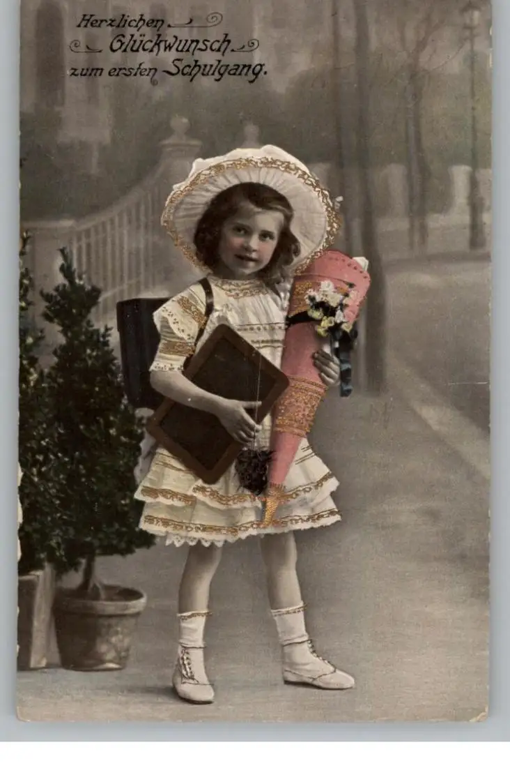 SCHULE - Erster Schultag, Mädchen mit Schultüte, goldgeprägt, Bahnpost Riesa - Elsterwerda