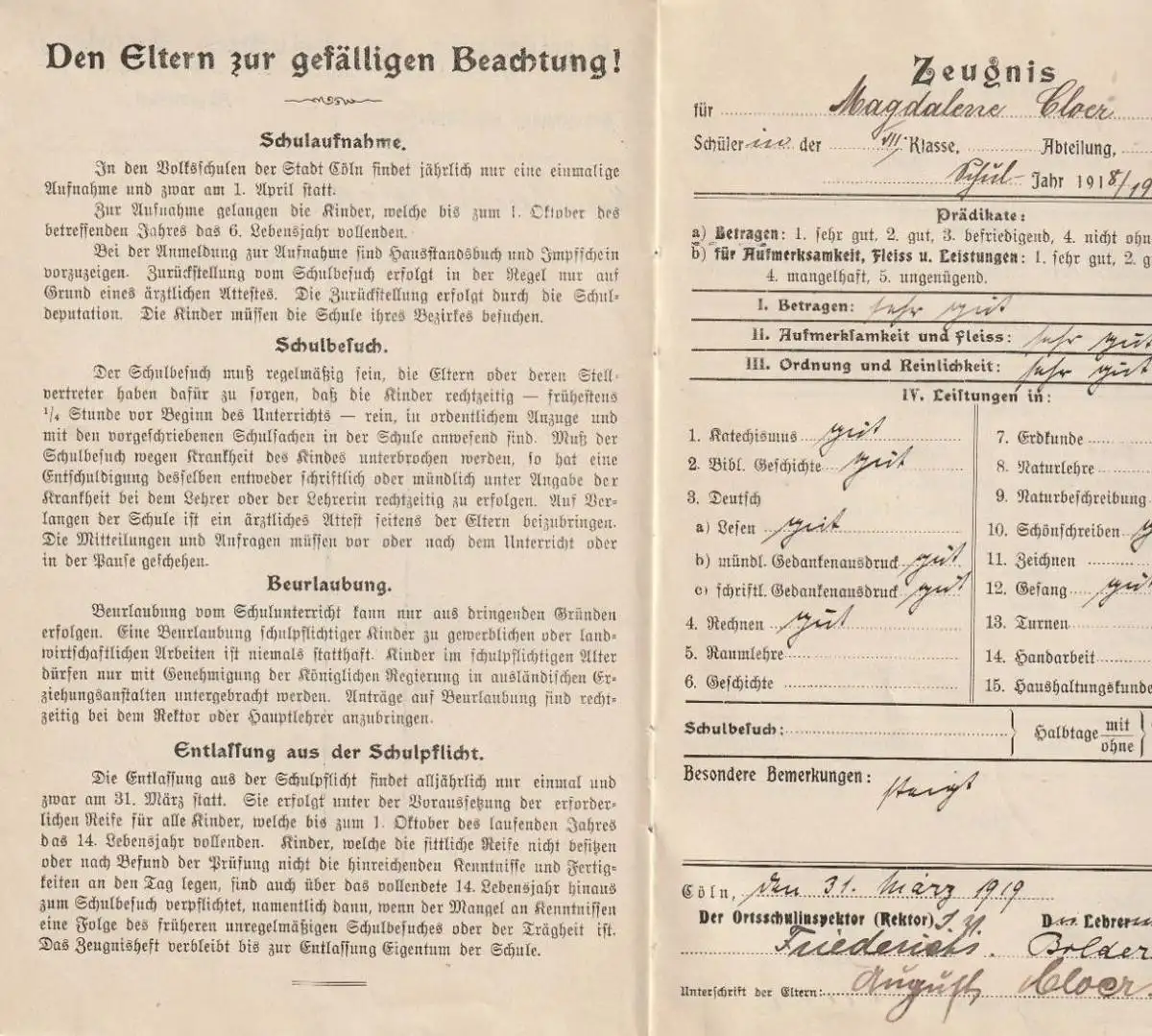 SCHULE - VOLKSSCHUL - ZEUGNISHEFT Stadt Köln 1918 - 1922