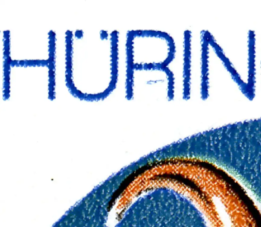 Druckvermerk Ag 114/231/82 V-5-2 mit Werbung GESAMTWERT / Sparen Sie Zeit, mit Plattenfehler: blauer Strich unten im ersten R von THÜRINGER [MICHEL 2835-F2A]
