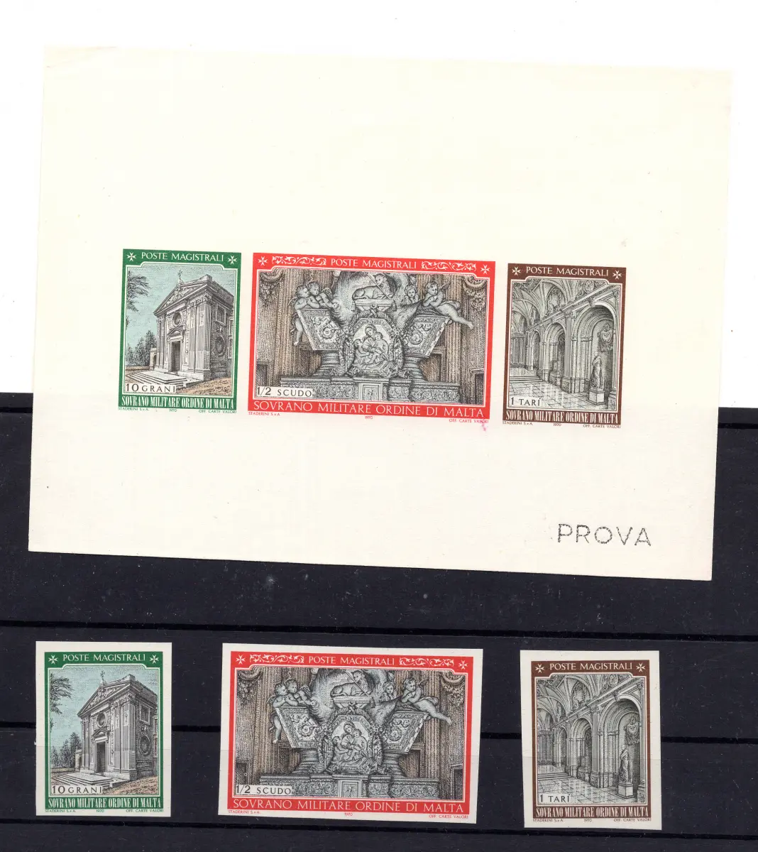 Ohne Gummi - SMOM - Weihnachten 1970 Nr. 62/64 komplette Serie Druckprobe auf weißem Papier ohne Wasserzeichen die gleiche Wiederholung in weißem Papierbogen ohne Wasserzeichen mit Stempel Proof unten rechts Euro-Katalog Cod.1807/WEB