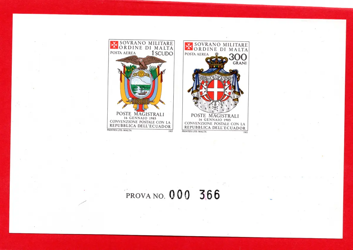 Ohne Gummi - SMOM - Abkommen mit Ecuador Luftpost Nr. 17/18 Blatt Druckprobe auf weißem Papier ohne Wasserzeichen Cod.1897/WEB