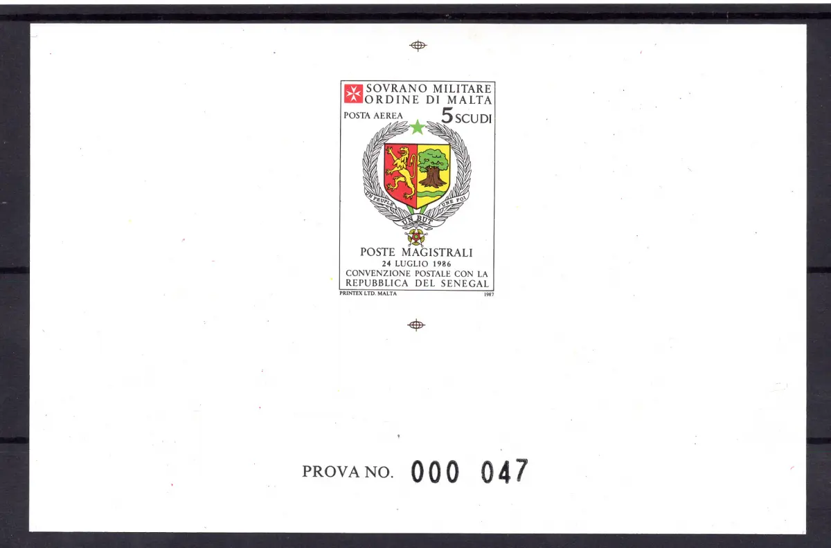 Ohne Gummi - SMOM - Abkommen mit dem Senegal Luftpost Nr. 27 Druckprobebogen auf weißem Papier ohne Wasserzeichen Cod.1881/WEB