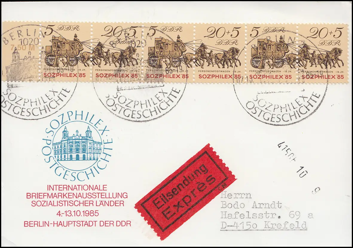 SOZPHILEX als Rand-6er-Zusammendruck-Streifen auf Eil-Karte SSt BERLIN 7.10.85